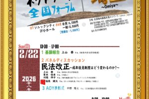 NEWS&TOPIX一覧を見る 2025年12月22日 2025年度第17回全国フォーラムのお知らせNEW 2025年10月08日 11/25(火)近畿ブロック研修会・交流会のお知らせ 2025年09月26日 12/15(月)弘前市『成年後見制度利用促進法における中核機関の役割と実務研修』 2025年09月22日 10/23(木)苫小牧市『これからの権利擁護支援を考える』研修会のお知らせ 2025年09月22日 10/17(金)佐渡市『成年後見制度における意思決定支援』研修のお知らせ 2025年09月01日 2024年度 日本財団助成金事業につきまして 2025年08月25日 「民法(成年後見等関係)等の改正に関する中間試案に関する意見」につきまして 2025年07月24日 9/13『第13回実践交流会』のお知らせ 2025年06月05日 7/25(金)宮崎市『意思決定支援と成年後見制度の調和を考える』研修会のお知らせ 2025年02月06日 3/15-16「権利擁護に関する相談支援事業従事者研修(知多市)」のお知らせ フォーラム・セミナー一覧を見る NEW 2025年度第17回全国フォー 詳細を見る >> 11/25(火)近畿ブロック研 詳細を見る >> 12/15(月)弘前市『成年後 詳細を見る >> 10/23(木)苫小牧市『これ 詳細を見る >> 10/17(金)佐渡市『成年後 詳細を見る >> 9/13『第13回実践交流会』 詳細を見る >>